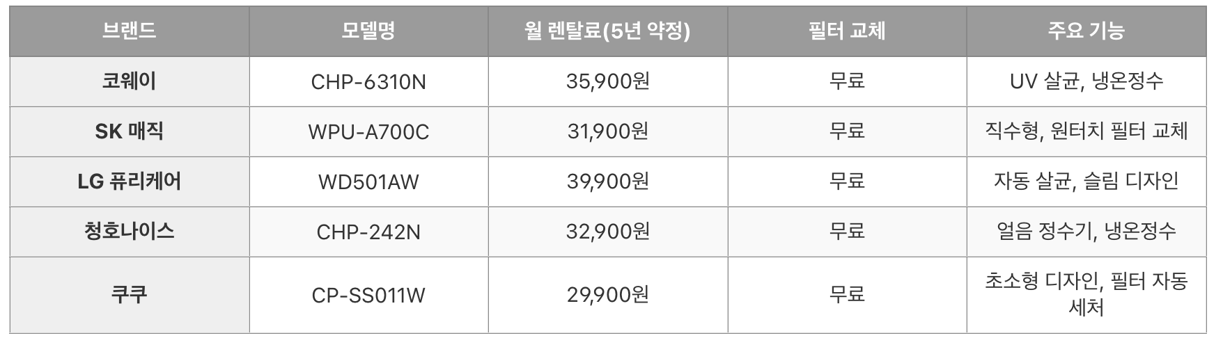 * 위 표는 2024년 12월 기준 주요 브랜드의 월 렌탈료를 비교한 표입니다. 모델마다 가격이 다르기 때문에 위 가격은 참고만 해주시길 바랍니다.